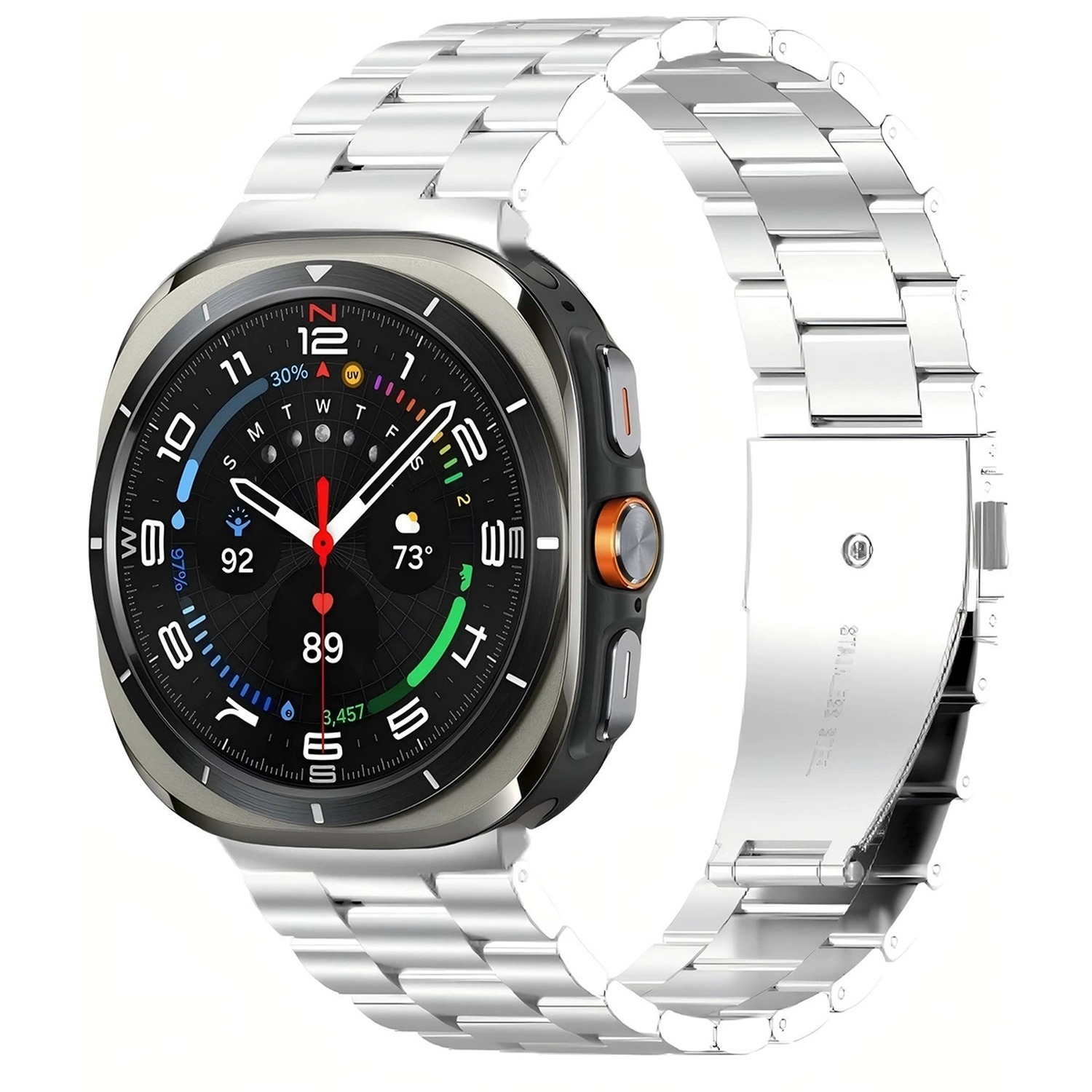 StrapsCo’s stainless steel replacement watch bands brings a classic, formal watch look to the Samsung Galaxy Watch 8. This band’s robust construction feels solid on the wrist and features a linked design with a fold over push button clasp, and is available in four classic colors. Removable links allow you to adjust the length of the bracelet as needed to fit your wrist (tools required).