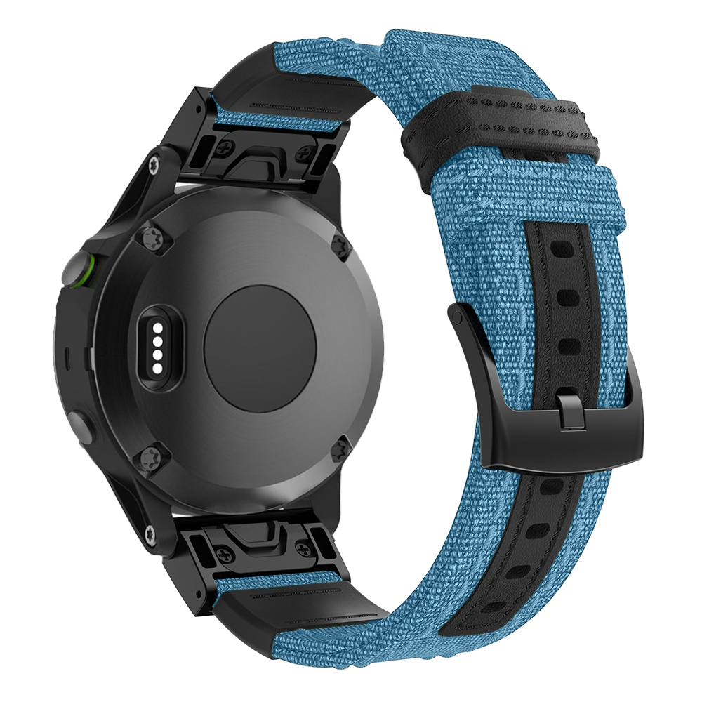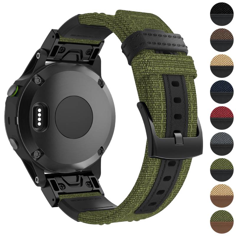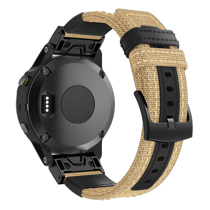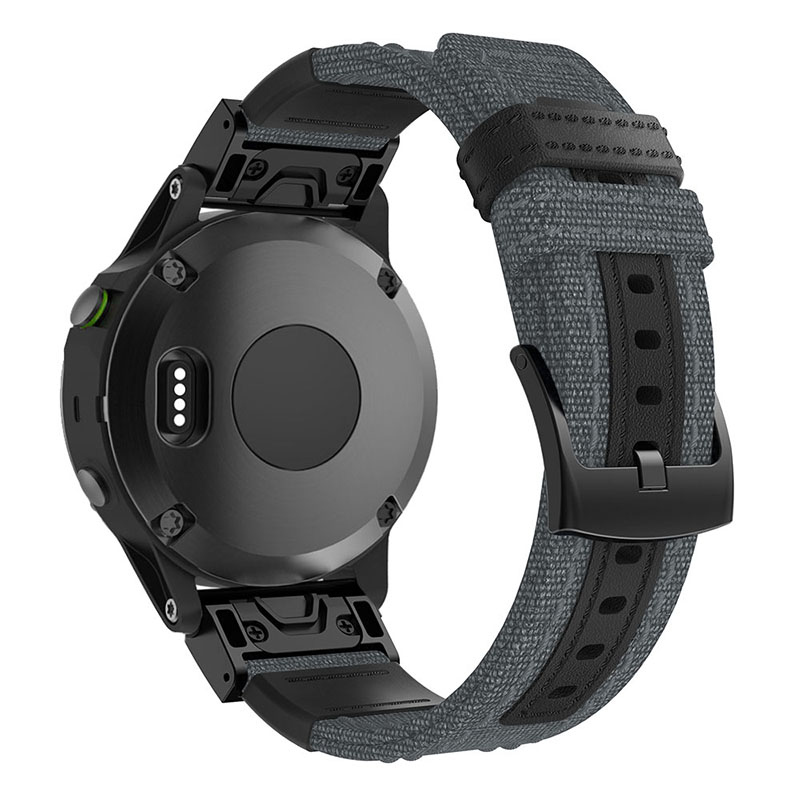 StrapsCo canvas replacement watch band for Garmin Watches. Similar to QuickFit, this band snaps on and off with ease. Made from durable, heavy-duty, woven fabric material. Finished with a black buckle.