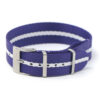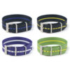 Premium quality stripe single-pass seat belt \watch bands made from a tightly woven nylon fabric with a silky finish. Extremely durable and comfortable to wear. Finished with laser sealed holes and heavy duty, brushed stainless steel silver buckle and hardware.