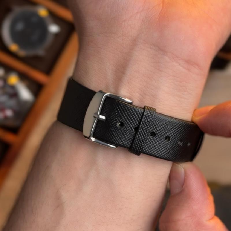 Our Thinline Saffiano Strap features a slim, tailored profile and timeless texture. Crafted from genuine leather and finished with a distinctive Saffiano crosshatch pattern, it pairs especially well with vintage and dress watches, enhancing elegance without adding bulk.