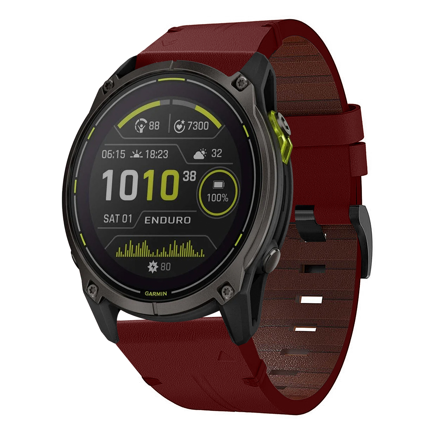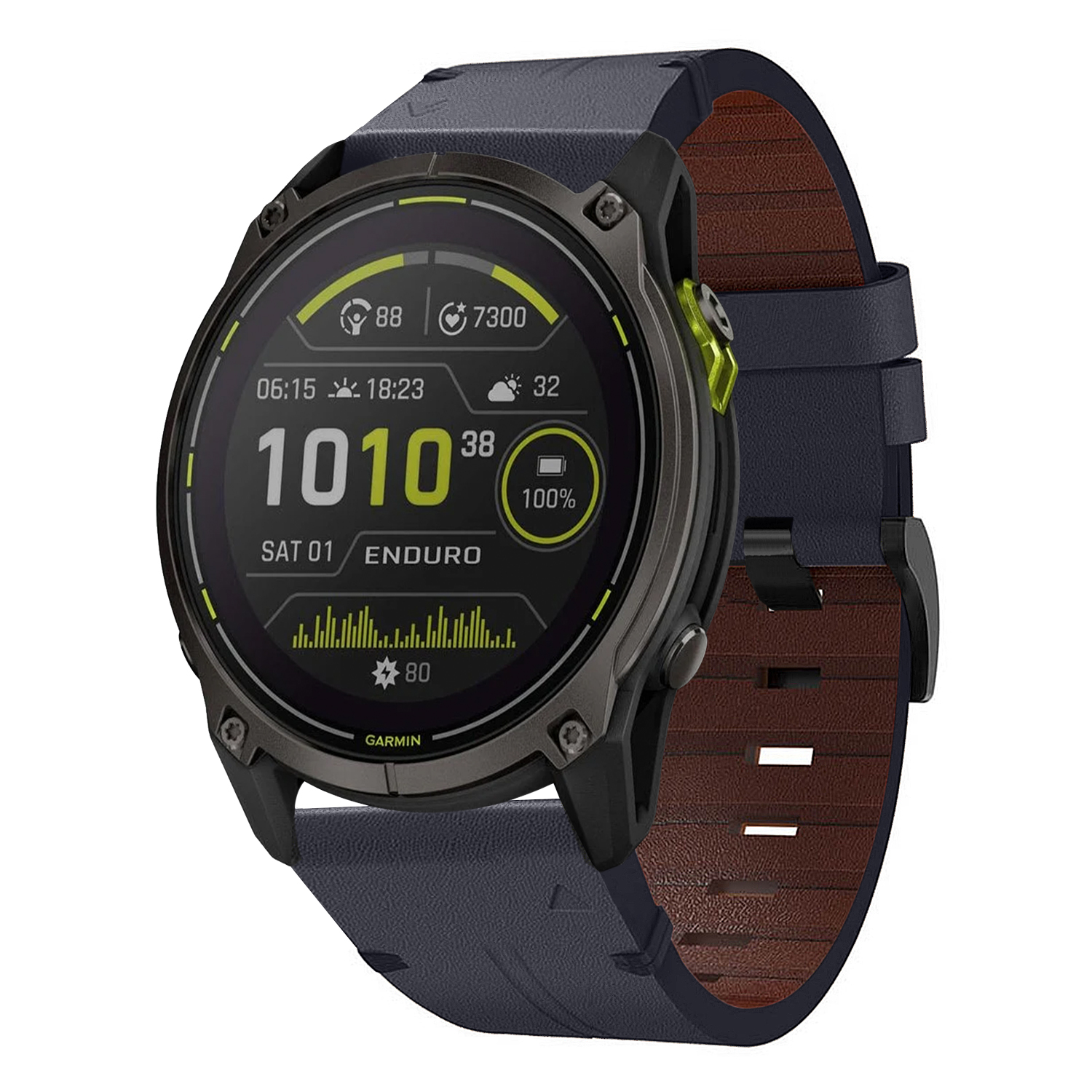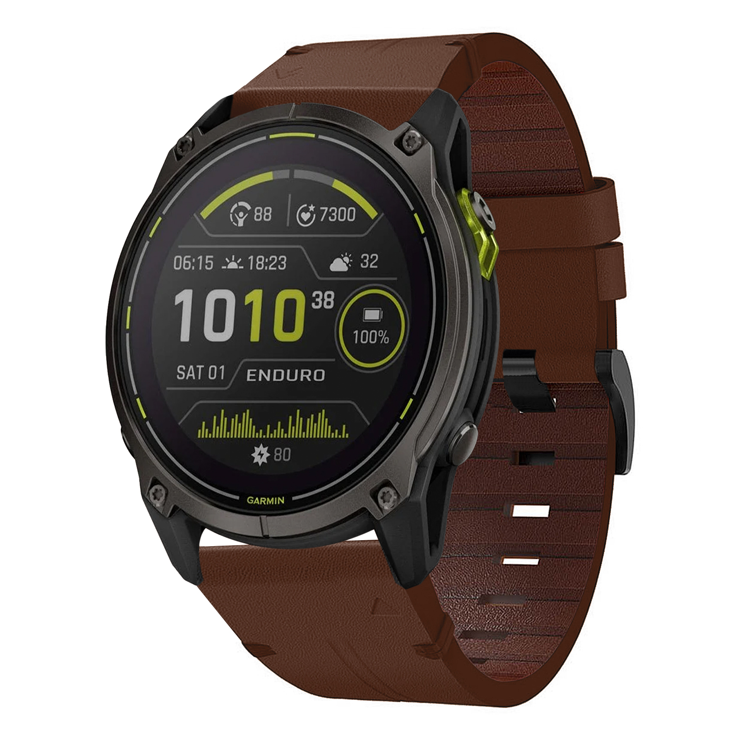 Made from only the best materials, StrapsCo’s Vintage Italian Leather Strap is a high-quality take on a classic. Durable, robust, and finished with our ShieldTek® Scratch Proof Buckle, this strap is built to last. Similar to QuickFit 26, this band snaps on and off your Garmin Enduro with ease.